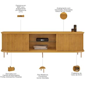 O design orgânico com cantos curvos harmoniza com as portas ripadas e os pés metálicos, trazendo um toque de contemporaneidade e seguindo as últimas tendências de decoração. Mais que o quesito estético, esse rack para TV ainda proporciona funcionalidade ímpar, já possui duas portas deslizantes para armazenar objetos, além de dois nichos para aparelhos eletrônicos e prateleira de vidro. Para completar o visual, o passa-fios facilita a organização dos cabos e mantém a bancada sempre em ordem. Adicione um toque de sofisticação a sua sala de estar com o rack bancada Atlantis. Você vai se surpreender.