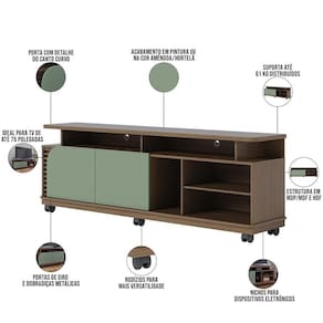 Com um design contemporâneo e elegante, esse rack para sala é uma peça com detalhes que deixarão o seu ambiente lindo como nunca, a começar pelos apliques decorativos em forma de ripas e pela porta usinada com acabamento curvo. Já o tampo de 25mm garante resistência e , além do espaço amplo para TVs de até 75 polegadas, enquanto a prateleira, os nichos e as duas portas de abrir oferecem praticidade para aparelhos eletrônicos e decorações. Para completar, os 6 rodízios são responsáveis pela versatilidade e facilidade na movimentação do rack, a fim de deixar a sua rotina mais prática. Demais não é mesmo?! Então, aproveite e garanta agora mesmo o seu Rack Laguna e crie uma sala de estar moderna e funcional.