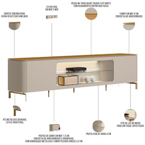 Além disso, os pés metálicos dourados adicionam um charme industrial elegante, unindo o rústico ao sofisticado em uma harmoniosa composição. Para completar, os nichos centrais não apenas embelezam com um toque único, graças à fita de LED, como também oferecem praticidade, servindo como suporte para aparelhos eletrônicos ou itens decorativos que expressam seu bom gosto e estilo.