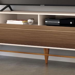 Com um tampo espaçoso, o Rack Erah é ideal para suportar TVs de grandes dimensões, ou seja, até 85 polegadas, tornando-se o centro de entretenimento da sua casa, enquanto portas oferecem espaço suficiente para armazenar os mais diversos itens, mantendo tudo organizado e ao seu alcance. Já os nichos centrais são ideais para dispor os aparelhos eletrônicos. Para completar, os pés em madeira maciça não apenas garantem estabilidade, como também conferem um charme rústico que complementa o design moderno. Cada detalhe foi pensado para criar uma peça que é ao mesmo tempo prática e cheia de personalidade.
