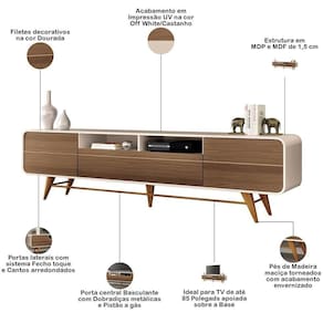 Altura: 57 cm | Color: Off White Castanho | ColorFamily: Off White | ColorSimple: Off White | ColorSupplier: Off White Castanho | Com compartimento para alto-falantes: Não | Com rodas: Não | Cor: Off White Castanho | Formato do móvel: Rack | Largura: 220 cm | Materiais do corpo: MDP, MDF | Material: MDP, MDF | Material da estrutura: MDP, MDF | Material das corrediças: na | MaterialFamily: MDP, MDF | Model: Erah | OriginCountry: Brasil | OriginState: PR | Peso: 37 Kg | ProductContents: 01 Rack | ProductHeight: 220 cm | ProductInstructions: Produto para uso em ambiente interno, nao devendo ficar exposto ao sol, calor e umidade excessivos. | ProductLength: 40 cm | ProductWarranty: 90 dias após o recebimento do produto | ProductWeight: 37 kg | ProductWidth: 57 cm | Profundidade: 40 cm | Quantidade de portas: 3 | Requer montagem: Sim | SizeDescription: Altura: 220 cm x Largura: 57 cm x Profundidade: 40 cm | SupplierSimpleName: Rack Para Sala de Estar TV 85 Pol Orgânico 220cm Erah B01 Off White Castanho - Lyam Decor | Tamanho máximo de TV: 85 Pol