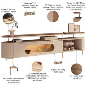 Seu design curvo e pés tubulares metálicos criam um equilíbrio único, enquanto a tonalidade ouro agrega um toque de sofisticação. Já as portas arredondadas com vidro embutido, a prateleira lateral em vidro e as laterais curvas completam o visual deslumbrante, ao passo que une funcionalidade e estilo em um só móvel. E tudo isso em 100% MDF, garantindo durabilidade e elegância. Em outras palavras, uma rack bancada perfeito para valorizar sua sala de estar. O Rack Sâmia é mais que um móvel, é uma declaração de bom gosto! Adicione ao seu carrinho e aproveite!