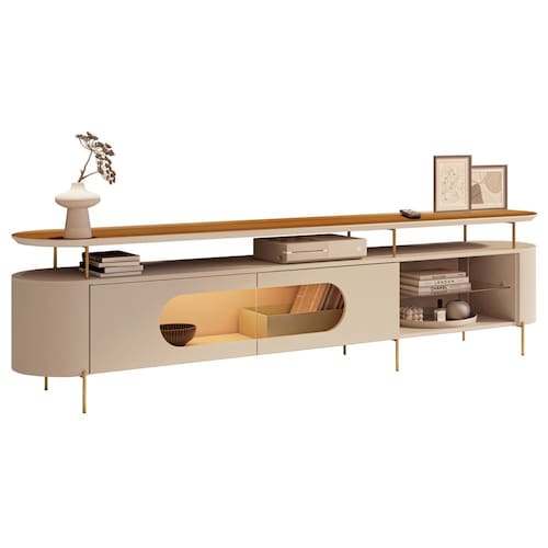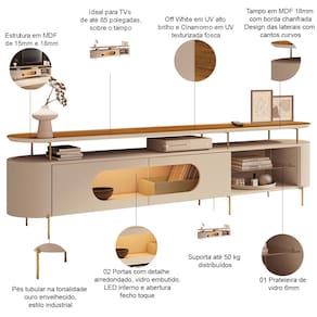 Seu design curvo e pés tubulares metálicos criam um equilíbrio único, enquanto a tonalidade ouro agrega um toque de sofisticação. Já as portas arredondadas com vidro embutido, a prateleira lateral em vidro e as laterais curvas completam o visual deslumbrante, ao passo que une funcionalidade e estilo em um só móvel. E tudo isso em 100% MDF, garantindo durabilidade e elegância. Em outras palavras, uma rack bancada perfeito para valorizar sua sala de estar. O Rack Sâmia é mais que um móvel, é uma declaração de bom gosto! Adicione ao seu carrinho e aproveite!