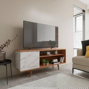 Rack Para Tv 42 Pol 136 Cm 1 Porta R1486 Amendoa Marmore Branco Tecno Mobili Amendoa Marmore Branco