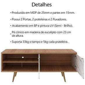 Rack Para TV 55 Pol 160 cm 2 Portas R1482, possui design retrô e sofisticado, entregando ao ambiente ar de requinte e muita modernidade. Estrutura em MDP de 25mm, já a divisão, a lateral direita, as portas e prateleiras são de 15mm de espessura, proporcionando maior durabilidade e resistência a peça, contando com acabamento revestido em BP e pintura UV (semi - brilho). Composto por 2 portas com dobradiças metálicas, 2 prateleiras com amplo espaço para armazenar diversos itens e pés cônico em madeira de eucalipto com 23 cm de altura. Suportando até 33kg o tampo e 5kg cada prateleira, é ideal para TV de até 55 polegadas. Perfeito para deixar seu ambiente produtivo, belo e organizado, ideal para compor sala de estar ou até mesmo hall de entrada. Este móvel chegará na sua casa separado em 1 volume.