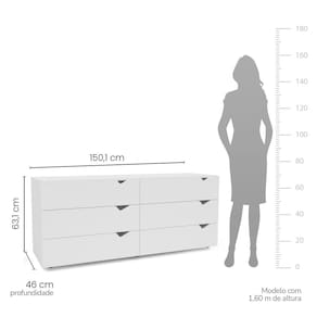 O rack 6 gavetas Porto, da Politorno Móveis, é uma opção sofisticada e funcional para a sua sala de estar. Com 63,1 cm de altura, 150 cm de largura e 46 cm de profundidade, oferece amplo espaço de armazenamento para organizar eletrônicos, acessórios e objetos decorativos. Fabricado em MDP/MDF, com acabamento em pintura UV, o rack garante resistência e durabilidade. Seu design atemporal e elegante combina facilmente com diferentes estilos de decoração, trazendo um toque refinado ao ambiente. As gavetas possuem corrediças telescópicas, que proporcionam deslizamento suave, e os puxadores externos facilitam o manuseio. Perfeito para quem busca qualidade, praticidade e sofisticação na sala de estar. Produto Montado: Sim Acabamento: Pintura UV Acabamento da Gaveta: Pintura UV Ambiente Principal: Sala de Estar codigo_ean: 7900288245731 Complexidade da Montagem: Média: pode ser montado por mais de uma pessoa e/ou necessite de maior conhecimento para montagem Cor: Branco Cor do Produto: Branco Cor Interna: Branco Escala de Brilho: Semi-Fosco Espessura do Tampo: 150 mm Gaveta com Chave: Não Ideal para TVs até (Polegadas): 65 Itens Inclusos: 1 Rack, Kit de Ferragens, Manual de Montagem e Termo de Garantia Linha ou Coleção: Porto Manual de Montagem e Instalação: https://product-hub-prd.madeiramadeira.com.br/700422081/documents/492aa423-2943-4cb0-a7ff-fdc6b02c36613249000622417592370169533.pdf Marca: Politorno Material da Gaveta: MDP Material dos Pés: Plástico Material Principal: MDP Necessita Montagem: Sim Peso: 46,13 kg Peso Máximo por Gaveta: 3 kg Possui Espelho: Não Possui iluminação: Não Possui Passa Cabos: Não Possui Pés: 06 Possui Portas: Não Possui Prateleiras: Não Possui Vidro: Não Quantidade de Gavetas: 06 Gavetas Recomendações de Uso, Manutenção e Limpeza: Utilize um pano macio umedecido com água e sabão neutro, seguido de pano seco. Não utilize produtos químicos ou abrasivos para limpeza, pois estes danificam o revestimento do móvel. Sapatas Niveladoras: Sim Sistema de Montagem: Cavilha, Parafuso, Minifix e prego. Tipo de Corrediça da Gaveta: Metálica Telescópica Tipo de Puxador da Gaveta: Embutido Marca: Não Informado
