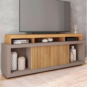 O(a) Rack para TV 75 Polegadas 2 Portas com Ripado Aegon Marrom/Cinza - Caemmun é produzido em MDF e MDP na escala de brilho Fosco, e possui um grau de dificuldade de montagem: Médio.