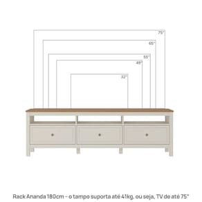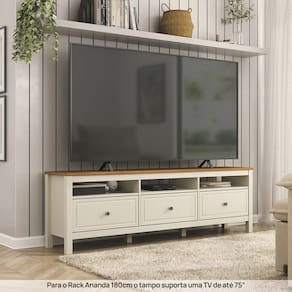 Ao escolher Ananda, você leva para casa um móvel de alta qualidade, produzido de forma ética e sustentável. Transforme sua sala em um espaço de bem-estar aconchegante com o Rack Ananda. Produto Montado: Sim Acabamento: Pintura UV Acabamento da Gaveta: Pintura UV Acabamento da Prateleira: Pintura Acabamento dos Pés: Pintura Altura dos Pés: 5,4 cm Altura Máxima dos Pés: 5.4000 Ambiente Principal: Sala de Estar codigo_ean: 7900288161543 Complexidade da Montagem: Média: pode ser montado por mais de uma pessoa e/ou necessite de maior conhecimento para montagem Cor: Off-White/Mel Cor da Caixa: Off White Cor do Produto: Off-White/Mel Cor Interna: Off-White Escala de Brilho: Semi-Brilho Escala de Brilho da Gaveta: Semi-Fosco Escala de Brilho da Prateleira: Semi-Brilho Espessura do Tampo: 18 mm Estilo do Pé: Moderno Gaveta com Chave: Não Ideal para TVs até (Polegadas): 75 Itens Inclusos: 1 Rack, Kit Ferragens e Manual de montagem Linha ou Coleção: Ananda Manual de Montagem e Instalação: https://product-hub-prd.madeiramadeira.com.br/788706405/documents/c063c10a-d3c5-4f63-b67c-0dffd3fd081c2960703644117484619939423.pdf Marca: CabeCasa MadeiraMadeira Material da Gaveta: MDF Material da Prateleira: MDF Material do Puxador da Gaveta: Metal Material dos Pés: Madeira Maciça Material Principal: MDF Necessita Montagem: Sim Peso: 38,24 kg Peso Máximo por Gaveta: 5 kg Peso Máximo por Prateleira: 5 kg Possui Adega: Não Possui Espelho: Não Possui iluminação: Não Possui Passa Cabos: Não Possui Pés: 06 Possui Portas: Não Possui Vidro: Não Quantidade de Gavetas: 03 Gavetas Quantidade de Nichos: 03 Recomendações de Uso, Manutenção e Limpeza: Pano levemente umedecido, não usar produtos químicos ou abrasivos Sapatas Niveladoras: Não Sistema de Montagem: Parafusos, cavilhas, minifix, corrediça e trapézio. Tipo de Corrediça da Gaveta: Metálica Telescópica Tipo de Madeira Maciça dos Pés: Pinus Tipo de Puxador da Gaveta: Externo