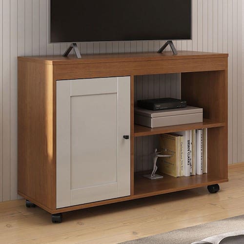 O(a) Rack para TV Até 42 Polegadas Rio 1 Porta Cinamomo/Off White - Pnr Móveis é produzido em MDF e MDP na escala de brilho Fosca com Textura, e possui um grau de dificuldade de montagem: Médio.