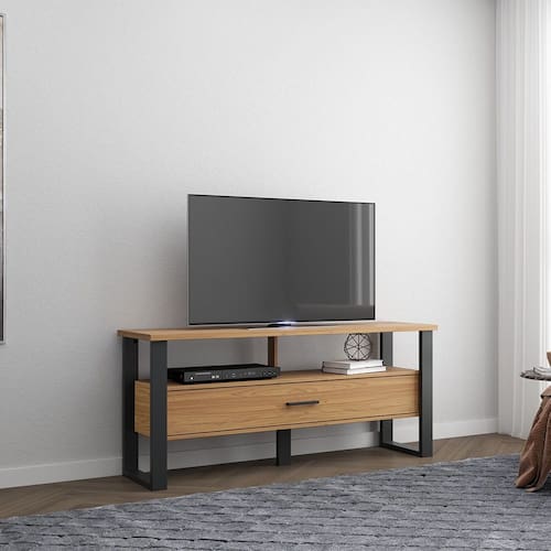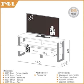 Características: Estrutura 100% MDF Acabamento em Pintura UV 01 Gaveta com Corrediças Metálicas Puxador Plástico Sapatas Plásticas Estilo Estilo Industrial Ideal para TV até 55 Polegadas
