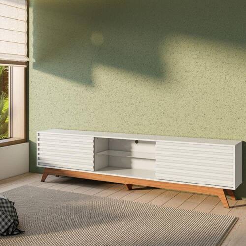 Características: Estrutura 100 em MDF Prateleira de vidro que suporta até 5kg distribuídos 2 Portas de correr Acabamento em pintura UV Passa fios Para TVs de até 60 polegadas