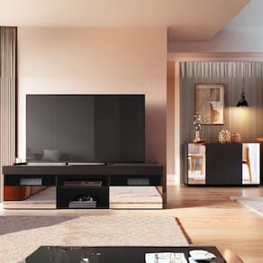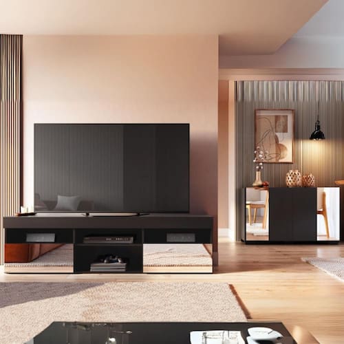 Detalhes que encantam: Os espelhos de vidro lapidados presentes nas portas do rack e aparador adicionam um toque de sofisticação e segurança, já que suas bordas não são cortantes. Além disso, criam uma agradável sensação de amplitude em qualquer espaço.
