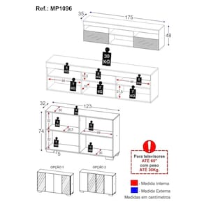 Especificações Técnicas: Rack - Altura: 48cm | Largura: 175cm | Profundidade: 35cm Aparador - Altura: 74cm | Largura: 123cm | Profundidade: 32cm Material: MDP 15mm proveniente de reflorestamento Acabamento: Acetinado Inclui Passa Fios: Sim Suporta TV de até: 65" Material dos Pés: Polipropileno