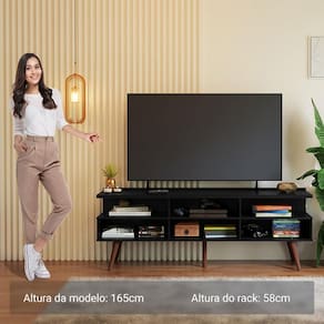 - Espaço versátil: Com prateleiras abertas e compartimentos fechados, acomoda eletrônicos, livros, e itens decorativos com organização e estilo