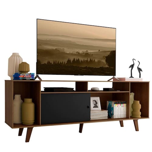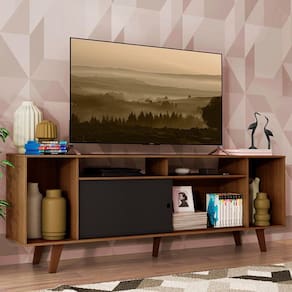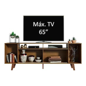 O tamanho é ótimo, comportando TV de até 65 polegadas. Possui nichos de espaços variados, entre abertos e fechados. Assim, cabe tudo de maneira organizada, desde aparelhos eletrônicos até objetos de decoração, livros e revistas.