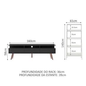 Itens inclusos: - Um (1) Rack com 58 cm de altura x 160 cm de largura x 36 cm de profundidade - Uma (1) Estante com 140 cm de altura x 61 cm de largura x 39 cm de profundidade