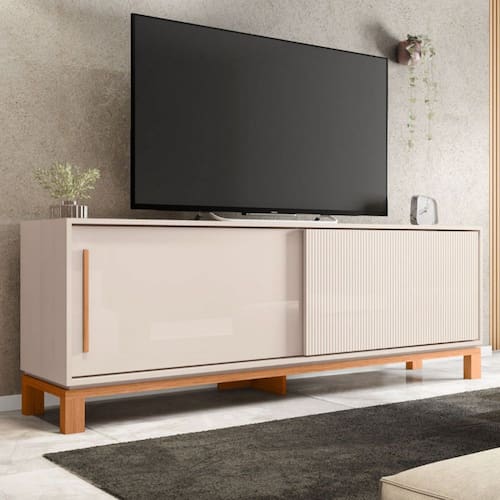 O(a) Rack para TV Até 65 Polegadas Mondrian 2 Portas Ripado 3d Off White/Freijó - Caemmun é produzido em MDP na escala de brilho Fosco, e possui um grau de dificuldade de montagem: Médio.