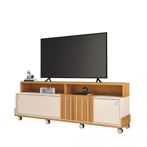 Características: Estrutura em MDP e MDF 2 Portas de correr Puxadores em Poliestireno Detalhe ripado Rodízios cromados Suporta até 40kg distribuídos Ideal para TVs até 70 polegadas