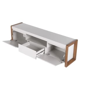 Ideal para TVs de até 75 polegadas, o rack conta com 2 portas, 1 gaveta, prateleira e nichos, oferecendo espaço ideal para organizar seus eletrônicos e objetos decorativos com praticidade.