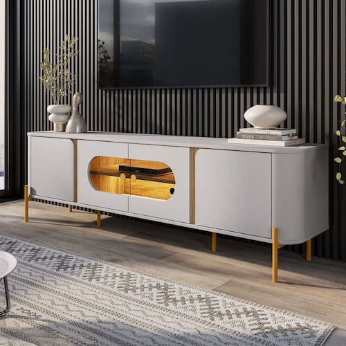 O(a) Rack para TV Até 75 Polegadas Juquehy 4 Portas com Vidro e Led Off White/Cinamomo - Móveis Bechara é produzido em MDP na escala de brilho Brilho, e possui um grau de dificuldade de montagem: Médio.