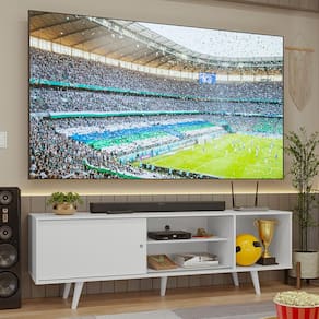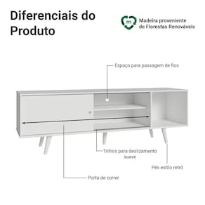 Na parte de trás, a abertura para passagem dos fios facilita a organização dos cabos. Os pés garantem charme e estabilidade. O acabamento branco traz leveza ao ambiente, combinando facilmente com diferentes estilos de decoração. Um móvel funcional e cheio de charme perfeito para renovar sua sala de estar.