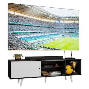 Na parte de trás, a abertura para passagem dos fios facilita a organização dos cabos. A combinação da estrutura em preto com a porta e os pés brancos destaca o design e traz mais peronalidade ao móvel.