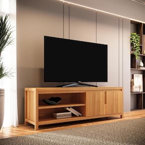 Produzido em madeira de pinus de reflorestamento, o rack oferece excelente resistência e funcionalidade. Conta com portas com dobradiças com amortecimento, nichos para eletrônicos e prateleiras internas que facilitam a organização de objetos, aparelhos e itens decorativos.