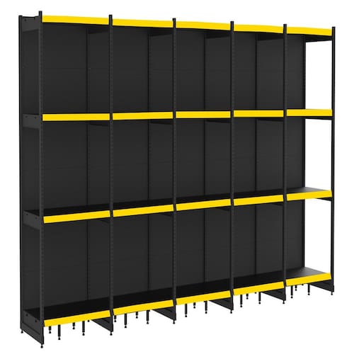 KIT GÔNDOLA RACK PAREDE OU LATERAL 202 FIT 1 INICIAL 4 CONTINUAÇÃO AMAPÁ 90X60 COR PRETO PORTA ETIQUETA AMARELO
