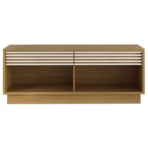Rack Tecnomobili RA2003, possui nichos e gaveta, estrutura em MDP e acabamento em pintura UV. Natural fosco texturizado e Off White brilho.