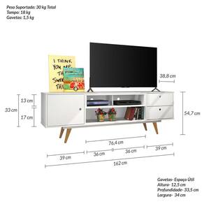 - Tamanho: Grande - Formato do Móvel: Rack - Peso do Produto Montado: 365 - Peso Máximo Suportado: 30 - Medida do Produto Montado (LXCXA): 38,5cmX162cmX54,7cm - Acabamento: Pintura UV - Escala de Brilho: Acetinado - Material da Estrutura: MDP de 15mm e MDF de 15 e 25mm - Produto Necessita de Montagem?: Sim - Quantidade de Gaveta: 2 - Tipo de Gaveta: Com Corrediça de Roldana - Quantidade de Pés: 4 - Tipo de Pés: De Madeira - Quantidade de Portas: 1 - Tipo de Porta: Com Dobradiça Metálica - Quantidade de Prateleiras: 3 - Tipo de Prateleira: Fixa - Quantidade de Nichos: 1 - Recomendações de manutenção: Pano úmido. Não aplicar lustra móveis. - Tamanho Máximo da Tv: Até 60 Polegadas - Volumes: 1 - Garantia: 3 Meses - Quantidade de Nichos: 2