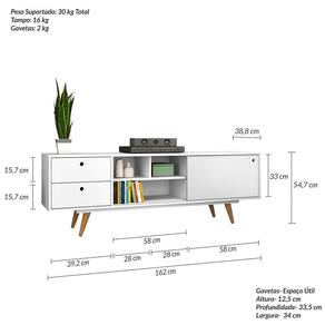 - Tamanho: Grande - Formato do Móvel: Rack - Peso do Produto Montado: 368 - Peso Máximo Suportado: 30 - Medida do Produto Montado (LXCXA): 38,5cmX162cmX54,7cm - Acabamento: Pintura UV - Escala de Brilho: Acetinado - Material da Estrutura: MDP de 15mm e MDF de 15 e 25mm - Produto Necessita de Montagem?: Sim - Quantidade de Gaveta: 2 - Tipo de Gaveta: Com Corrediça de Roldana - Quantidade de Pés: 4 - Tipo de Pés: De Madeira - Quantidade de Portas: 1 - Tipo de Porta: De Correr - Quantidade de Prateleiras: 5 - Tipo de Prateleira: Fixa - Quantidade de Nichos: 2 - Recomendações de manutenção: Pano úmido. Não aplicar lustra móveis - Tamanho Máximo da Tv: Até 60 Polegadas - Volumes: 1 - Garantia: 3 Meses