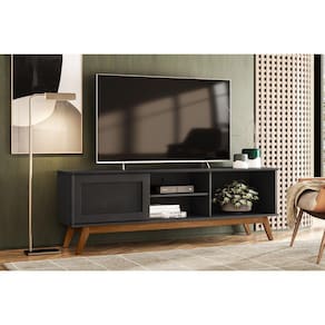 O Rack Retrô Palha Panamá é de MDP e MDF de 15 mm. Possui um design único com tampo e a base em MDF com bordas chanfradas, uma porta deslizante também em MDF com telinha bege ou preta, dependendo da cor do Rack. Os pés são chassi em madeira envernizada, deixando o ambiente aconchegante e com personalidade. Possui três nichos para colocar objetos e eletrônicos e um espaço ótimo para sua TV com passa fio. Produto Montado: Sim Acabamento: Pintura UV Acabamento da Porta: Pintura UV Acabamento da Prateleira: Pintura UV Acabamento dos Pés: Verniz Altura dos Pés: 18,6 cm Altura Máxima dos Pés: 18.6000 Ambiente Principal: Sala de Estar codigo_ean: 7908308783904 Complexidade da Montagem: Baixa: pode ser montado por uma pessoa sozinha Cor: Preto Cor do Produto: Preto Cor Interna: Preto Escala de Brilho: Semi-Brilho Escala de Brilho da Porta: Semi-Brilho Escala de Brilho da Prateleira: Semi-Brilho Ideal para TVs até (Polegadas): 60 Informações Complementares: Porta em MDF com a Telinha Itens Inclusos: 1 Rack, Kit Ferragens e Manual de Montagem Linha ou Coleção: Linha Manual de Montagem e Instalação: https://product-hub-prd.madeiramadeira.com.br/838413/documents/b599b3dc-0021-4571-82a8-8b859d0aea8dnualdemontrackrpalhapanamA.pdf Material da Porta: MDF Material da Prateleira: MDP Material dos Pés: Eucalipto Material Principal: MDF/MDP Montagem Flex: Não Necessita Montagem: Sim Origem do Produto: Nacional Peso: 24 kg Peso Máximo por Prateleira: 2 kg Possui Espelho: Não Possui iluminação: Não Possui Pés: 04 Possui Portas: Sim Possui Prateleiras: Sim Quantidade de Nichos: 03 Recomendações de Uso, Manutenção e Limpeza: Pano úmido. Não aplicar lustra móveis. Sapatas Niveladoras: Não Sistema de Montagem: Parafusos e Minifix. Tipo de Dobradiça/Corrediça da Porta: Plástica Tipo de Madeira Maciça dos Pés: Pinus Tipo de Porta: Correr Tipo de Puxador da Porta: Embutido
