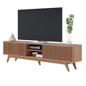 CARACTERÍSTICAS TÉCNICAS: - Produzido em MDP 15 e 25mm, MDF de 15 e 25mm e HDF de 3mm - Acabamento Fosco com Pintura UV - Portas com Ripado artesanal e Dobradiça Metálica - Pés em Madeira Maciça com 20 cm de Altura - Peso Suportado no Tampo de 40 kg - Peso Suportado na prateleira de 3kg - Ideal para TV até 75 Polegadas - Possui 4 Portas, 1 Prateleira e 2 Nichos