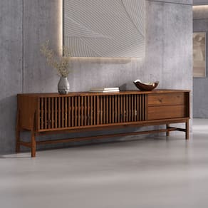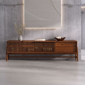 Feito de madeira. Feito para durar. O Rack Adamo 145 cm traduz o equilíbrio entre design, funcionalidade e leveza. Produzido em madeira maciça, seu acabamento revela veios naturais e textura autêntica, transformando o ambiente com elegância e durabilidade. Com uma porta ripada deslizante, o móvel mantém um visual limpo e sofisticado, sem puxadores aparentes. As linhas verticais criam um efeito contemporâneo e atemporal, perfeito para quem busca uma peça de destaque em espaços menores. O tampo acomoda TVs de até 65”, enquanto os nichos internos amplos organizam eletrônicos e objetos decorativos de forma prática. A gaveta com corrediça telescópica e sistema de fecho-toque garante abertura suave e total, ideal para armazenar controles e acessórios. A estrutura elevada, com pés e travessas laterais, reforça a estabilidade e facilita a limpeza, mantendo a leveza visual característica da Linha Adamo.