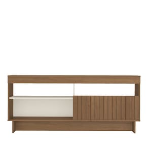 Características: 1 Porta basculante Amplo espaço de armazenamento Detalhes ripados em baixo relevo Design minimalista e versátil Estrutura resistente de MDF/MDP de 15mm de espessura com pintura UV Suporta com segurança TVs de até 65 polegadas