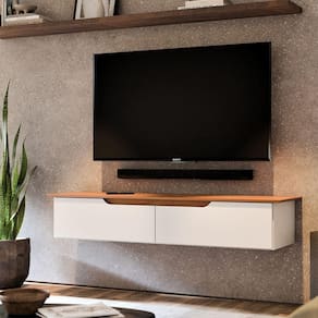 Rack Suspenso Eros Off White Com Freijo Transforme sua sala com o requinte e a funcionalidade do Rack Suspenso Eros. Este elegante móvel é projetado para enriquecer seu ambiente, oferecendo um toque de sofisticação e praticidade. Com design moderno, o Eros possui um tampo chanfrado invertido que se destaca visualmente. As duas portas sem puxadores são emolduradas por uma régua frontal em duas cores, adicionando exclusividade ao móvel. Além de funcional, o Rack Eros proporciona espaço para exibir objetos decorativos, mantendo o ambiente organizado e ões:Altura: 32,5 cmLargura: 138 cmProfundidade: 34 cmObservações:- Estrutura elaborada em MDF e MDP, garantindo durabilidade e resistência.- Tampo chanfrado invertido, proporcionando um design único e sofisticado.- Portas sem puxadores, com detalhe em régua em duas cores.- Ideal para organizar e decorar, adicionando um toque moderno à sala.