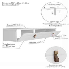 - Formato do móvel: Rack - Quantidade de Portas: 2 - Tamanho: Médio - Garantia: 3 Meses - Volumes: 1 - Acompanha Suporte de TV?: Não - Tamanho Máximo da Tv: Até 55 Polegadas - Recomendações de manutenção: Pano úmido. Não aplicar lustra móveis. - Tipo de Porta: Basculante - Quantidade de Portas: 2 - Produto Necessita de Montagem?: Sim - Peso do Produto Montado: 175 - Material da Estrutura: Mdp - Escala de Brilho: Acetinado - Acabamento: Pintura UV - Peso Máximo Suportado: 22 - Medida do Produto Montado (LXCXA): 30cmX160cmX21cm