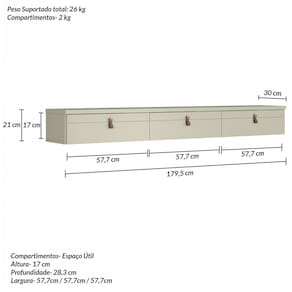 O Rack Suspenso Line 1795mm é um produto com um design moderno, possui três portas basculantes em MDF com frisos e puxadores caracterizando o couro natural. Sua estrutura é em MDF e MDP de 15 e 25mm, possui três compartimentos internos. É um produto que você poderá instalar na parede de qualquer ambiente, no estilo contemporâneo, personalizando e deixando-o exclusivo.