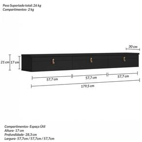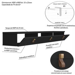 O Rack Suspenso Line 1795mm é um produto com um design moderno, possui três portas basculantes em MDF com frisos e puxadores caracterizando o couro natural. Sua estrutura é em MDF e MDP de 15 e 25mm, possui três compartimentos internos. É um produto que você poderá instalar na parede de qualquer ambiente, no estilo contemporâneo, personalizando e deixando-o exclusivo.