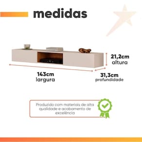 Importante sobre a : A é realizada até a portaria ou porta de entrada do indicado, desde que o acesso seja permitido. Para locais com portaria, a será feita no piso térreo. Não realizamos montagem, desmontagem, por escadas ou içamento. É responsabilidade do cliente verificar se as dimensões do produto são compatíveis com portas, elevadores e corredores. Evite imprevistos: confira todos os detalhes antes de concluir sua compra. MEDIDAS RACK:: A = 21,2 cm L = 143 cm P = 31,3 cm | MEDIDAS NICHO:: A = 18,2 cm L = 45,8 cm P = 27,5 cm | PESO:: 14,25 kg | PESO SUPORTADO:: 40 kg | NICHO SUPORTA ATÉ:: 5 kg | IDEAL PARA TV DE ATÉ:: 65 Polegadas | MODELO:: Rack Suspenso para Painel ou TV até 65 Polegadas 1,43m 2 Portas com Nicho Montreal | MARCA:: DJ Móveis | COR:: Off White | ACABAMENTO:: Melamina | PINTURA:: UV de alta qualidade, 8 camadas | MATERIAL:: MDP | ESPESSURA DO MATERIAL DA ESTRUTURA:: 15 mm | NICHOS:: 1 | PORTAS:: 2 | TIPO DE PORTA:: Basculante | PUXADOR:: Cava | POSSUI PASSA CABOS:: Sim | DIFERENCIAIS:: Design Clean / Bancada suspensa espaçosa / Pintura UV de alta qualidade, 8 camadas / Espaço para aparelhos eletrônicos / 2 portas basculantes / 1 nicho para melhor armazenamento. | INSTRUÇÕES E CUIDADOS:: Para maior durabilidade, recomendável que a limpeza dos móveis seja feita com pano limpo e seco. Não usar produtos químicos ou abrasivos. | SISTEMA DE MONTAGEM:: Minifix, cavilhas e parafusos. | GARANTIA:: 3 meses pelo fabricante. | AVISO:: Importante sobre a : A é realizada até a portaria ou porta de entrada do indicado, desde que o acesso seja permitido. Para locais com portaria, a será feita no piso térreo. | Altura: 21,2 cm | Formato do móvel: Rack | Inclui manual de montagem: Sim | Largura: 143 cm | Profundidade: 31,3 cm | Quantidade de caixas de embalagem: 1 | Requer montagem: Sim | Altura da embalagem: 7 cm | Comprimento da embalagem: 147 cm | Largura da embalagem: 32 cm | Peso da embalagem: 15350 g | Tipo da embalagem: sem embalagem adicional | Cor: Off White