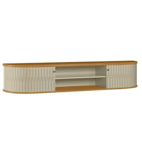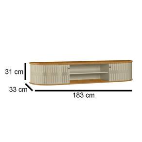 Seu tampo e base com bordas curvas trazem suavidade ao design, enquanto as portas flexíveis em MDF garantem acesso prático e discreto aos compartimentos internos. Os puxadores em poliestireno reforçam o acabamento minimalista, e a estrutura em MDP de 15 e 25 mm proporciona resistência e durabilidade.
