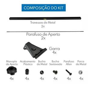 Projetado e desenvolvido para suportar até 45 kg de peso máximo, desde que distribuído de forma uniforme e equilibrada; Manual de instruções, para orientar a montagem, sua capacidade de transporte, regras de utilização e outros informes; Não amassa e nem risca o veículo; Cor preto; Fabricado em aço; Não exige furações; Fácil instalação; Ótimo acabamento; Excelente resistência.