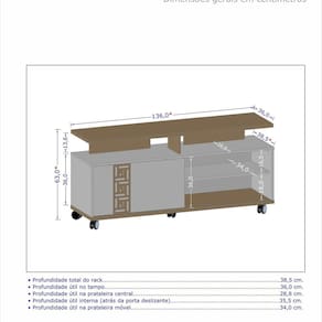 O Rack Topázio é ideal para sua sala. Com designer moderno ele conta com 5 rodízios sendo eles 2 frontais com acabamento cromado e 2 com trava. Porta de correr com lindo aplique usinado a laser na porta. Possui também 4 nichos ideias para acomodar os mais variados tipos de objetos de decoração, aparelhos eletrônicos entre outros. Possui tampo e base elaborado em MDP de 2,5cm, demais componentes da estrutura em MDP de 1,5cm, garantindo qualidade e resistência ao produto. Suporta TVs de até 52 polegadas. Acabamento: Pintura UV Acabamento da Porta: Pintura Texturizada UV Acabamento da Prateleira: Pintura Texturizada UV Acabamento dos Pés: Pintura Ambiente Principal: Sala de Estar codigo_ean: 7900288081490 Complexidade da Montagem: Baixa: pode ser montado por uma pessoa sozinha Cor: Naturalle/Off-White/Ripado Cor do Produto: Naturalle/Off-White/Ripado Escala de Brilho: Semi-Brilho Escala de Brilho da Porta: Semi-Brilho Escala de Brilho da Prateleira: Semi-Brilho Ideal para TVs até (Polegadas): 52 Informações Complementares: Produto elaborado em MDP sendo o tampo e a base de 25mm e demais componentes em MDP de 15mm. Porta de correr com aplique decorativo usinado a laser. Acabamento de superfície por pintura/impressão com verniz UV em padrões Premium semi-brilhantes, com textu Itens Inclusos: 1 Rack Topázio 1 Manual de Montagem Linha ou Coleção: Tradicional Manual de Montagem e Instalação: https://product-hub-prd.madeiramadeira.com.br/580522/documents/b7fbe740-6f35-4c46-97c1-ab06e766559fnualdemontagemed001pp01a06.pdf Marca: Móveis Bechara Material da Porta: MDP Material da Prateleira: MDP Material do Puxador da Porta: MDP Material dos Pés: PVC Material Principal: MDP Montagem Flex: Não Necessita Montagem: Sim Origem do Produto: Nacional Peso: 34,2 kg Peso Máximo por Prateleira: 4 kg Possui Espelho: Não Possui iluminação: Não Possui Pés: 05 Possui Portas: Sim Possui Prateleiras: Sim Possui Vidro: Não Quantidade de Nichos: 04 Recomendações de Uso, Manutenção e Limpeza: Recomenda-se limpar o produto com flanela ou pano macio seco, não utilizar produtos abrasivos, desengordurantes, álcool ou solvente. Mantê-lo em lugar livre de umidade e/ou exposição direta ao sol. Rodízio com Trava: Sim Sapatas Niveladoras: Não Sistema de Montagem: Parafusos, Minifix, Cavilhas e Pregos. Tipo de Porta: Bater Tipo de Puxador da Porta: Embutido Tipo de Rack: Rack Padrão