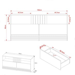 Dimensões do produto montado: Altura: 62cm | Largura: 136cm | Profundidade: 35,2cm *Devido as variações de tamanho dos televisores no mercado, sugerimos que verifique as medidas da sua TV e compare com o rack antes de efetuar a compra.