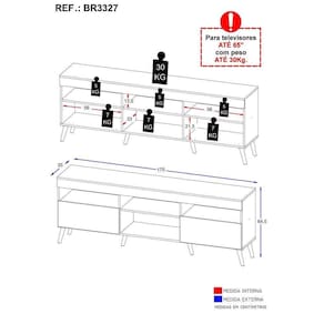 Dimensões do produto montado: Altura: 64,5cm | Largura: 175cm | Profundidade: 35cm *Devido as variações de tamanho dos televisores no mercado, sugerimos que verifique as medidas da sua TV e compare com o rack antes de efetuar a compra. *Você pode consultar as medidas internas na imagem técnica do produto.