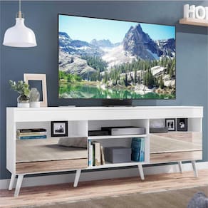 O Rack TV 65" Retrô com Espelho 2 Portas Paris Multimóveis é produzido em MDP com acabamento acetinado, que garante maior durabilidade e facilidade na limpeza. Possui 4 nichos com espaço para os equipamentos eletrônicos e objetos decorativos, 2 portas articuladas com espelho e um amplo espaço interno para manter seus pertences organizados e os pés palito, estilo retrô, em polipropileno, que dão um charme especial ao móvel deixando-o com um visual leve e permitindo você compor um ambiente com ar vintage e moderno ao mesmo tempo. Os espelhos de vidro (evita que a imagem fique distorcida) e lapidados, ou seja, passam por um processo para que as bordas não fiquem cortantes, o que garante maior segurança, deixam o móvel mais requintado e a sua sua sala mais bonita e confortável para curtir os melhores filmes e séries com a família e amigos.