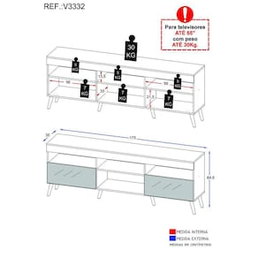 Dimensões do produto montado: Altura: 64,5cm | Largura: 175cm | Profundidade: 35cm *Devido as variações de tamanho dos televisores no mercado, sugerimos que verifique as medidas da sua TV e compare com o rack antes de efetuar a compra. *Você pode consultar as medidas internas na imagem técnica do produto.