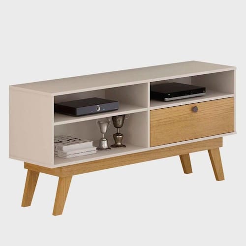 Rack Houston da Valdemóveis é moderno e clássico ao mesmo tempo. Seus pés possuem design exclusivo e uma gaveta basculante. Ainda contém nicho para seus aparelhos eletrônicos.