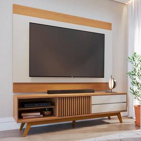 Rack Veneza e Painel Nilo combinam estilo contemporâneo e funcionalidade para transformar sua sala. Produzidos em MDP/MDF (15/25 mm), com acabamento em pintura UV texturizada. Composto por porta de correr com detalhes ripados (alto relevo), gavetas com corrediças telescópicas, prateleira, passa fios embutidos, tampo em MDF (25 mm) e pés em madeira maciça (Pinus 20 cm) com travas. Painel suporta TVs de até 75 polegadas (Rack TVs de 75 polegadas) com segurança. Este conjunto chegará em sua casa separado em 3 volumes.