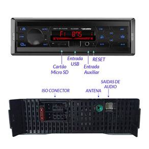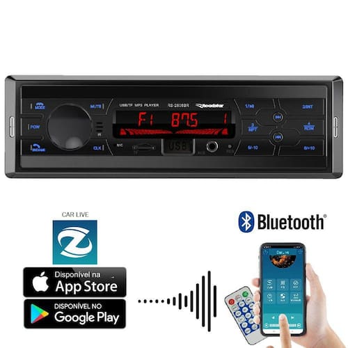 O auto rádio RS-2608BR possui entrada frontal auxiliar, entrada frontal para cartão micro SD, entrada frontal USB, conexão Bluetooth, saída de áudio e conexão ISO.